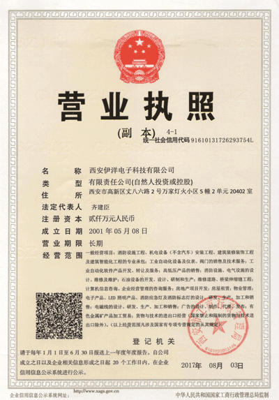 西安伊洋電子科技有限公司,成立于2001年,坐落于陜西西安,是國內具有消防設施施工一級資質,專業從事智能建筑消防設施工程,機電設備安裝工程的專業公司;是陜西省、西安市民營科技企業,中韓企業合作促進會理事單位,中國消防企業聯盟委員會會員單位,2013中國消防行業十大科技創新企業。西安伊洋電子科技有限公司在2014年2月注資成立...>>詳細內容